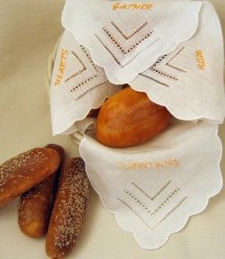 "Gather With Grateful Hearts" shown stitched on our Bunwarmer. Click Here to view this classic linen bread cloth.